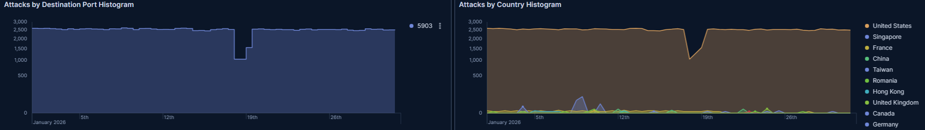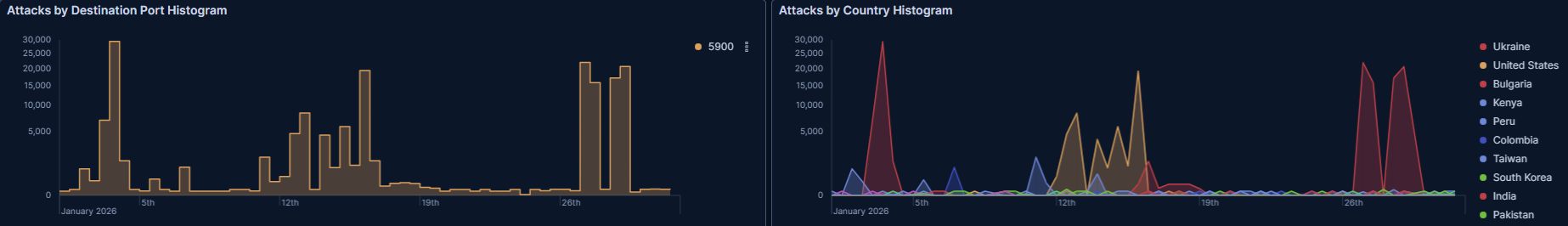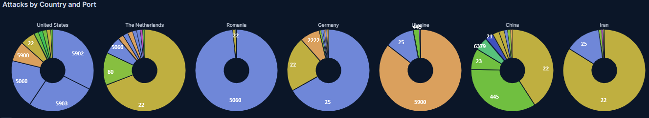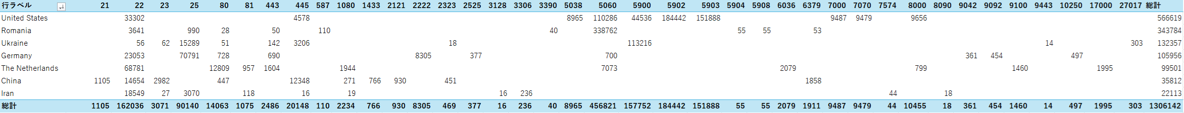先月のアメリカは5060番ポートへのアクセスが多かったですが、それはルーマニアに譲りました。その分5900番台へのVNCへのアクセスと思われるアクセスがダントツです。