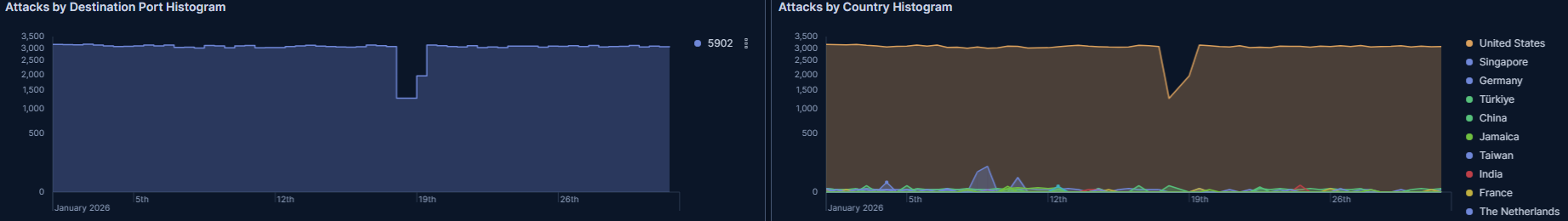 今週は5900番台(5902,5903)が多数を占めています。VNC関係のポートにアクセスしているものと考えられます。
