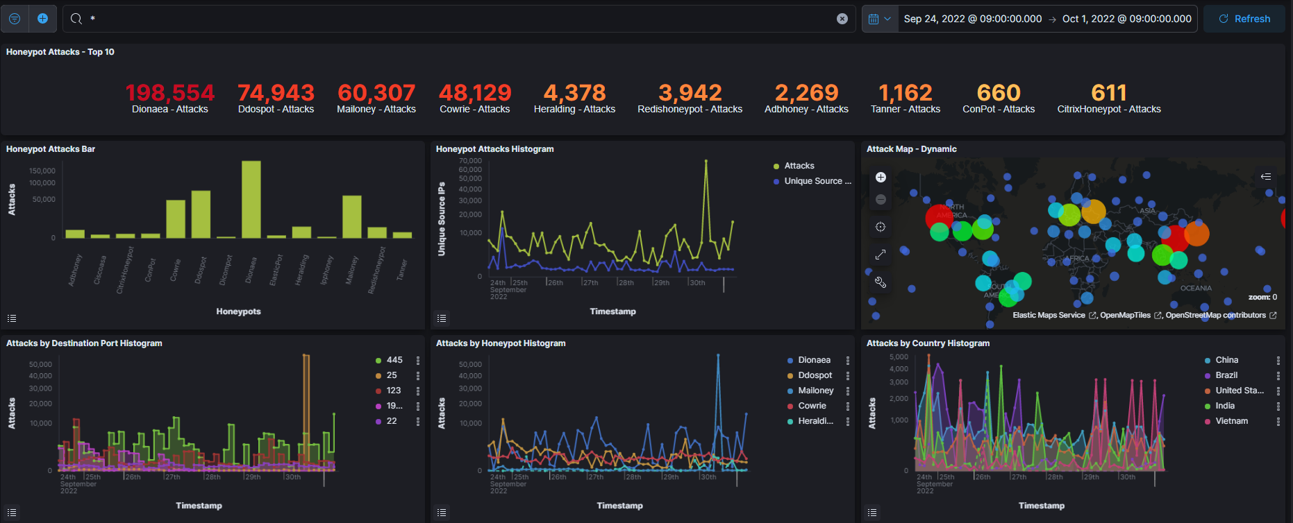 T-Potは、様々なハニーポットを同時に運用できるアプリケーションです。私自身は、まだまだ駆け出しなので、T-Potに備えづけられたKibanaのデフォルトしか使えません。そしてさらにそこから得られる情報は、知識不足から間違いが多いだろうと思います。そのため、本ブログに記載の分析は、私自身の現在の知識から判断されたものであることを念頭にお読みください。また、間違い等があれば、教えていただけると幸いです。